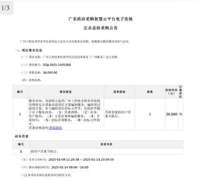 近日,一份《廣東政府采購智慧云平臺電子賣場定點(diǎn)競價(jià)成交公告》在網(wǎng)上流傳,該公告顯示,1月14日,名稱為“廣州工程技術(shù)職業(yè)學(xué)院信息技術(shù)服務(wù)(廣州集采)定點(diǎn)采購”的項(xiàng)目,本次定點(diǎn)競價(jià)項(xiàng)目采用公開邀請的競價(jià)方式,被廣州一信息科技有限公司以0.01元的金額中標(biāo)。